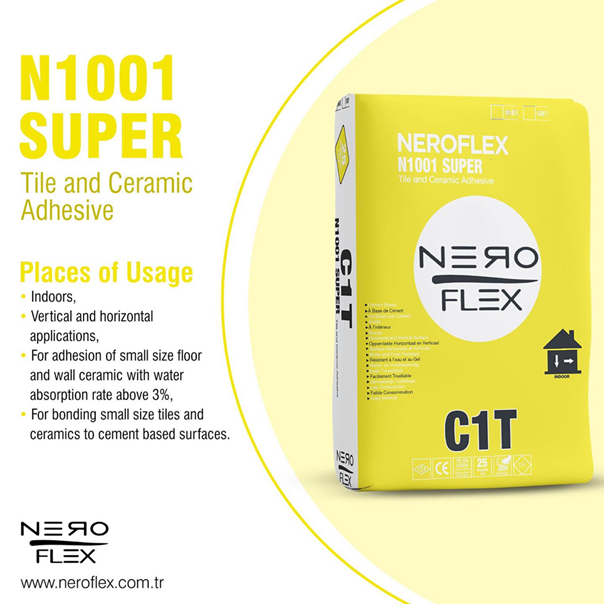 N1001 Super layer of 1 mm thickness is applied to the application surface with the flat side of the trowel. N1001 Super is applied in one direction in such a way that a uniform thickness is obtained with the toothed side of the trowel to an area that can be covered within 20 minutes, open waiting time. For the bonding of tiles or ceramics with different thicknesses, it is recommended to apply 1 mm thick mortar under each tile or ceramic in order to cover the defects on the application surface. When applying tiles or ceramics in place, the tiles or ceramics are floated in the mortar to ensure that the N1001 Super is fully in contact. Application is completed by leaving the recommended joint gap according to the appropriate tile or ceramic size.