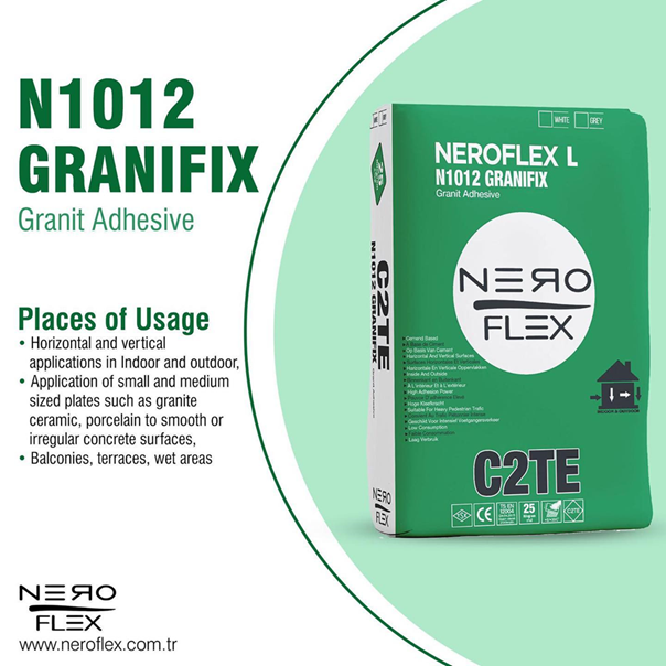N1012 Granifix layer of 1 mm thickness is applied to the application surface with the flat side of the trowel. N1012 Granifix is applied in one direction in such a way that a uniform thickness is obtained with the toothed side of the trowel to an area that can be covered within 20 minutes, open waiting time. For the bonding of tiles or ceramics with different thicknesses, it is recommended to apply 1 mm thick mortar under each tile or ceramic in order to cover the defects on the application surface. When applying tiles or ceramics in place, the tiles or ceramics are floated in the mortar to ensure that the N1012 Granifix is fully in contact. Application is completed by leaving the recommended joint gap according to the appropriate tile or ceramic size.