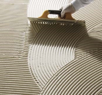 25 kg Powder should be poured onto 5 It liquid component slowly and should be mixed until a homogeneous mixture is obtained. The mixture should be made with a low speed mixer. 2-3 kg of water should be added to the liquid component. The prepared mortar should be rested for 5-10 minutes to mature. It should be mixed again for 1-2 minutes before application. In order to obtain a better bonding surface, the mortar should be spread on the surface with the flat side of the trowel and then combed with the toothed side of the trowel selected according to the tile size. Combined bonding method should be preferred in exterior applications.