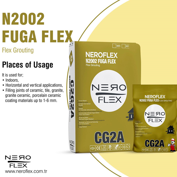 N2002 Fuga Flex joint filter (1-6 mm) İs added into about 6-7 It of clean water and mixed preferably with a low speed mixer until no lump remains. Pay attention to the amount of water to be added to the powder mortar, avoid application in the form of grout added excess water. Excess water added to the mortar will cause cracking, easy wear and dusting. The prepared grouting material in thick consistency is left to rest for 5 -10 minutes for maturation and used after mixing for 1-2 minutes again. The mixture in the container should be consumed within about 1 hour.