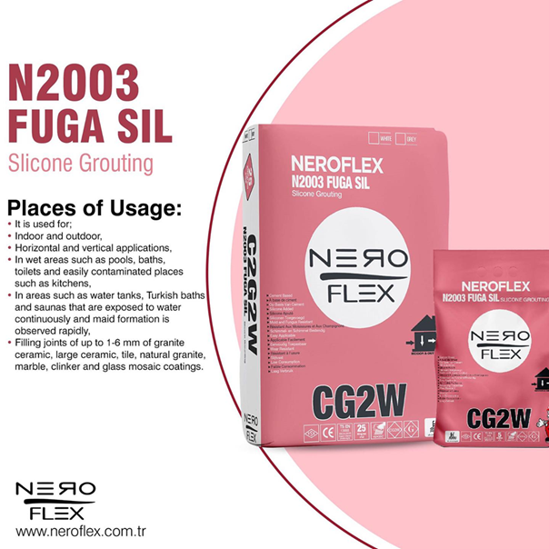 20 kg N2003 Fuga Sil joint filter (1-6 mm) is added into about 6-7 It of clean water and mixed preferably with a low speed mixer until no lump remains. Because joint fitler added to the water is silicone additive, there may be difficulties in the mixing in the first place. Continue mixing with the mixer until a homogeneous appearance is achieved. Pay attention to the amount of water to be added to the powder mortar, avoid application in the form of grout added excess water. Excess water added to the mortar will cause cracking, easy wear and dusting. The prepared grouting material in thick consistency is left to rest for 5 -1 0 minutes for maturation and used after mixing for 1 -2 minutes again. The mixture in the container should be consumed within about 1 hour.
